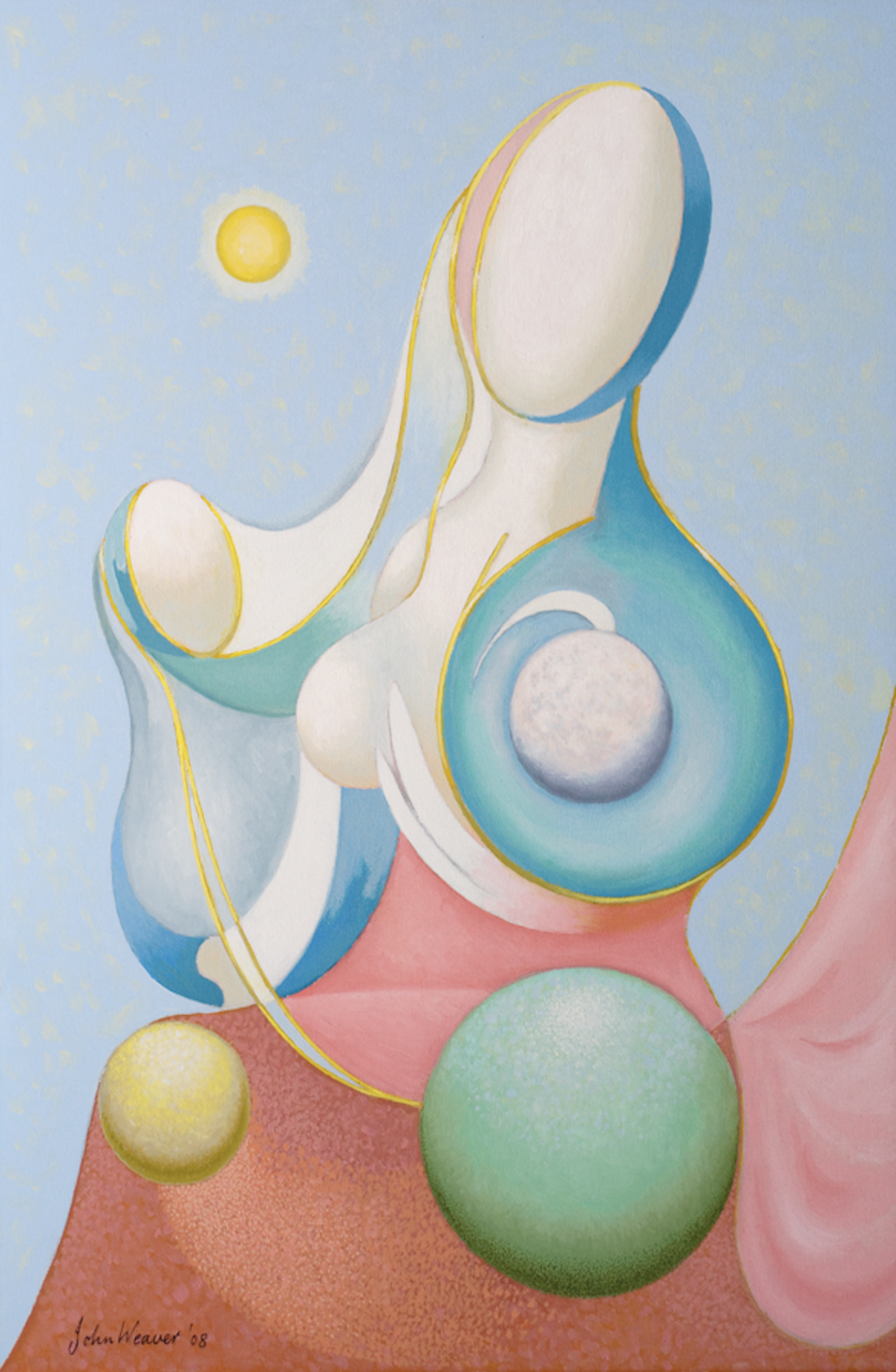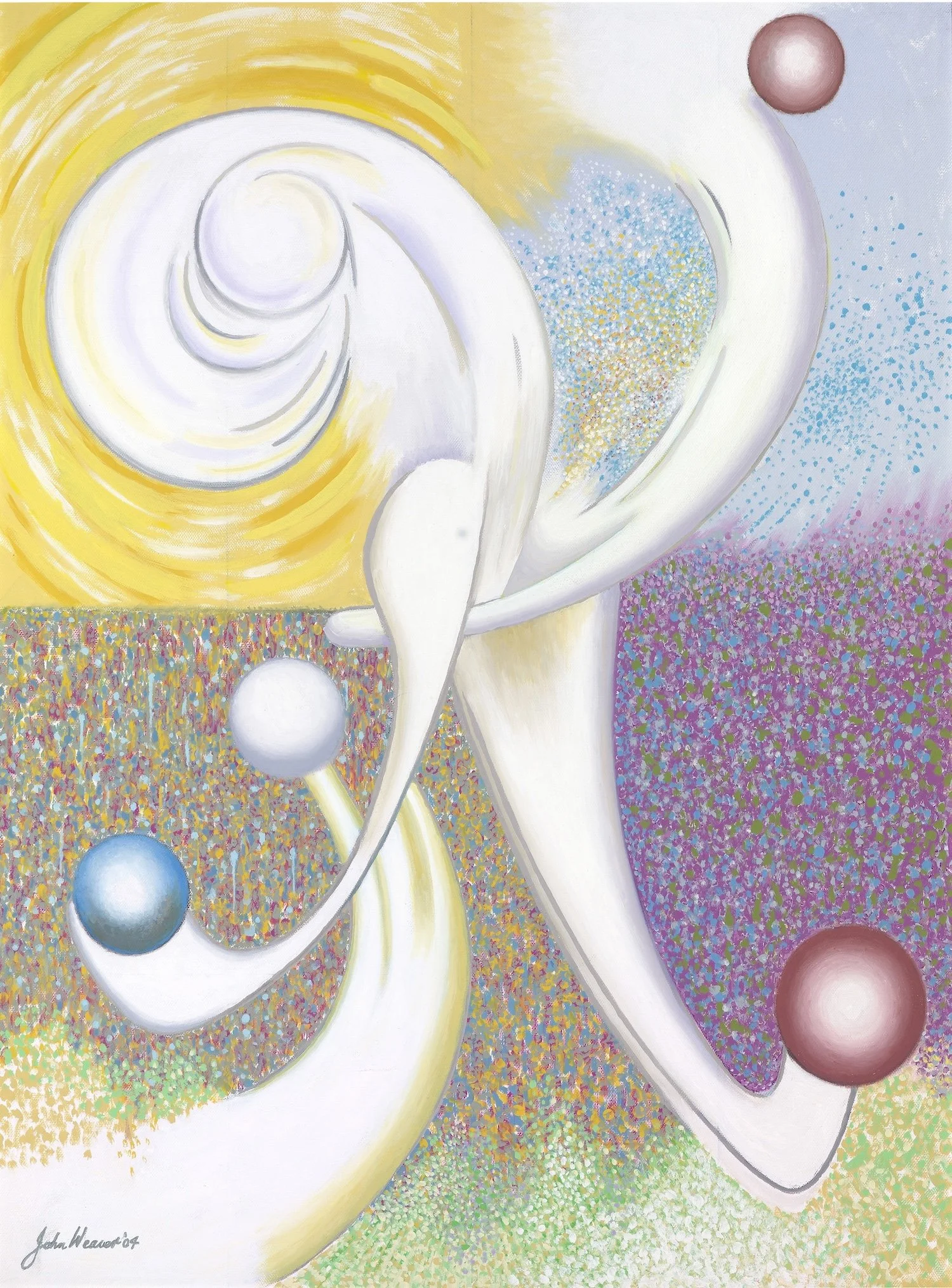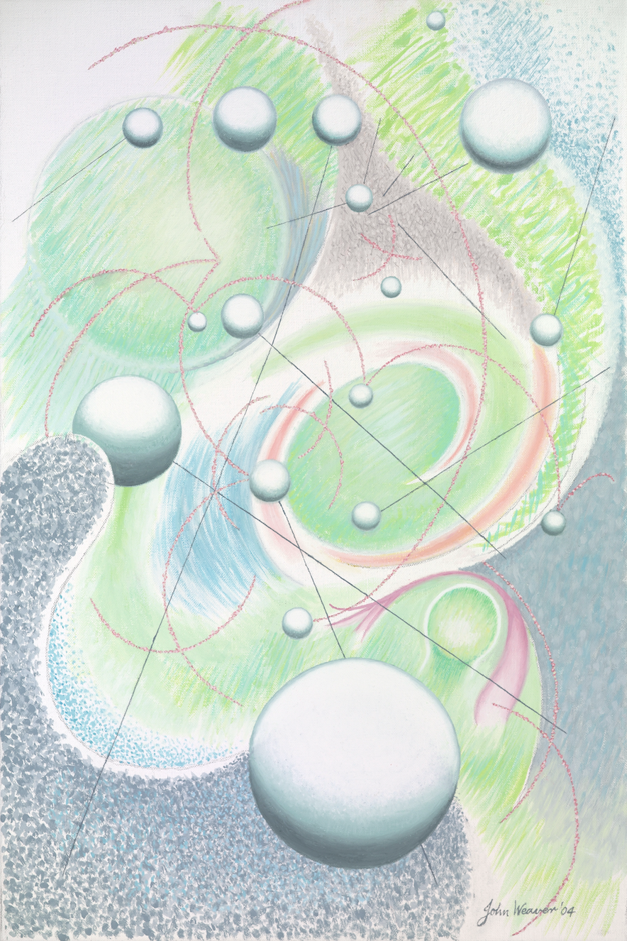 John loved talking about his Spatial composition project. He was a surreal classical artist favoring his unique concept of space beyond earth, outside the solar system. His paintings are classical in composition, and abstract in subject. His great concern was his classical spatial composition with every item in the picture relating to its distance in the real world from the other elements. He would say that they were not a mere cosmic chance but an absolute orientation of every item within the frame and that there is no question that it is crucial to the resolution of his paintings.