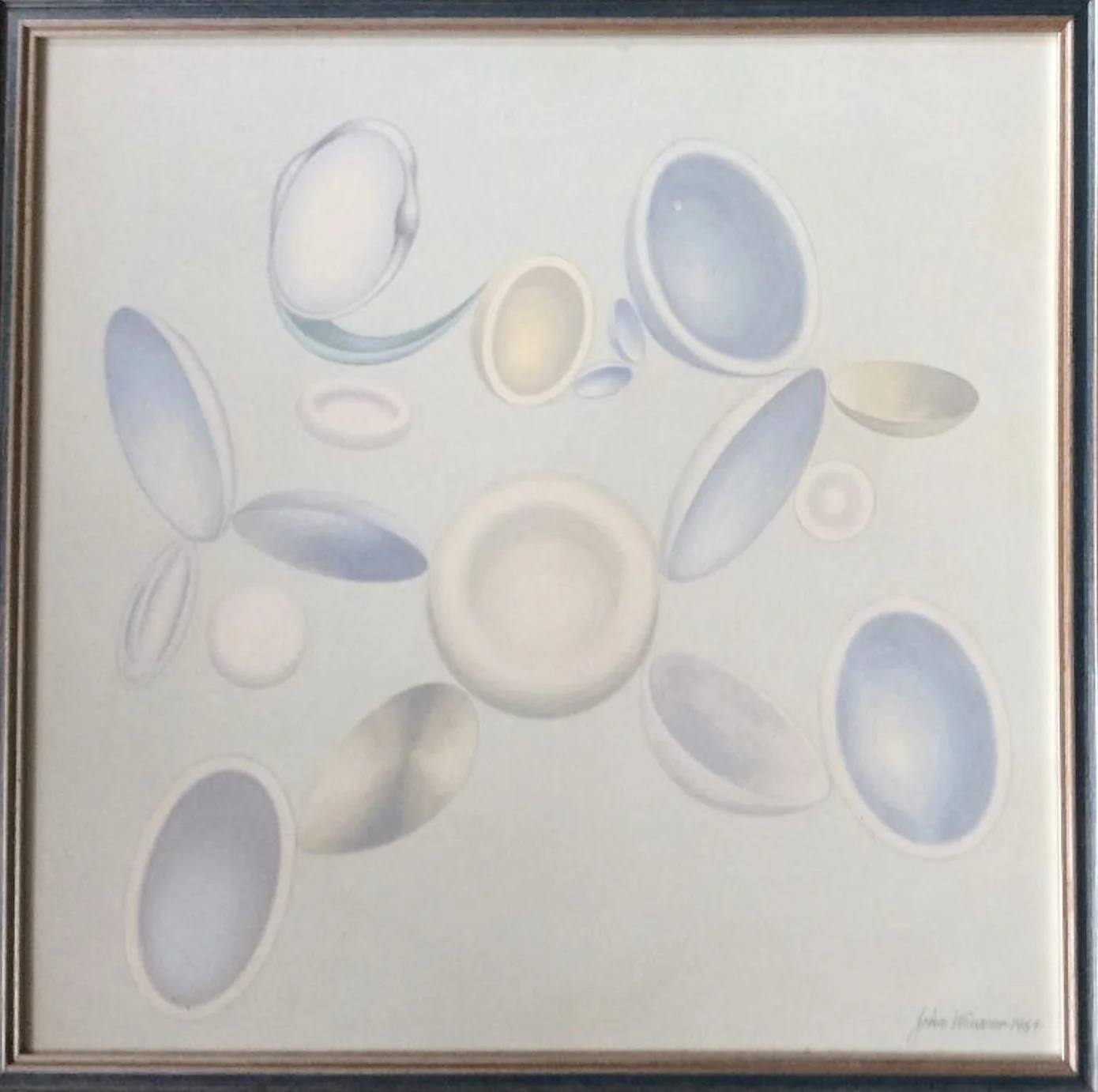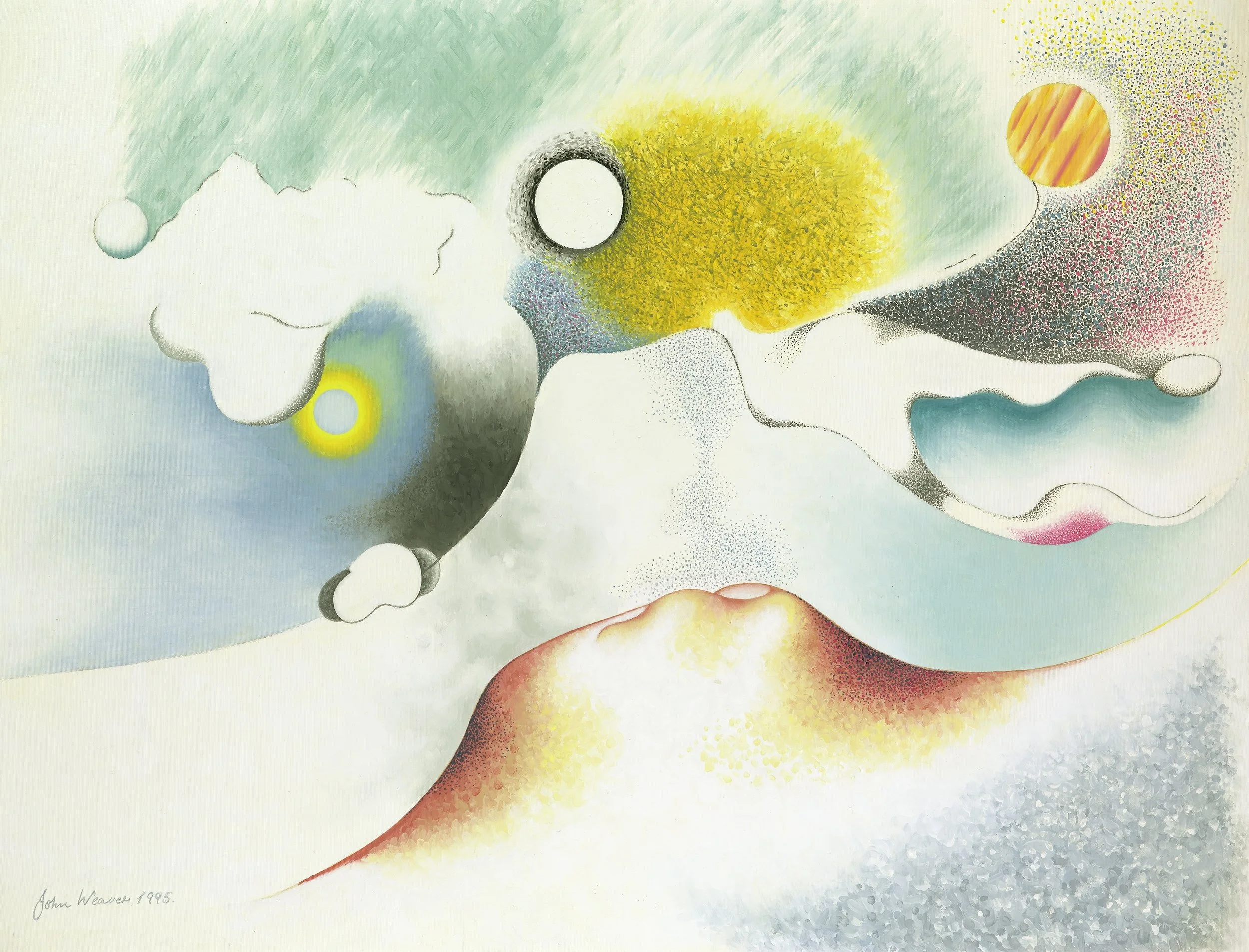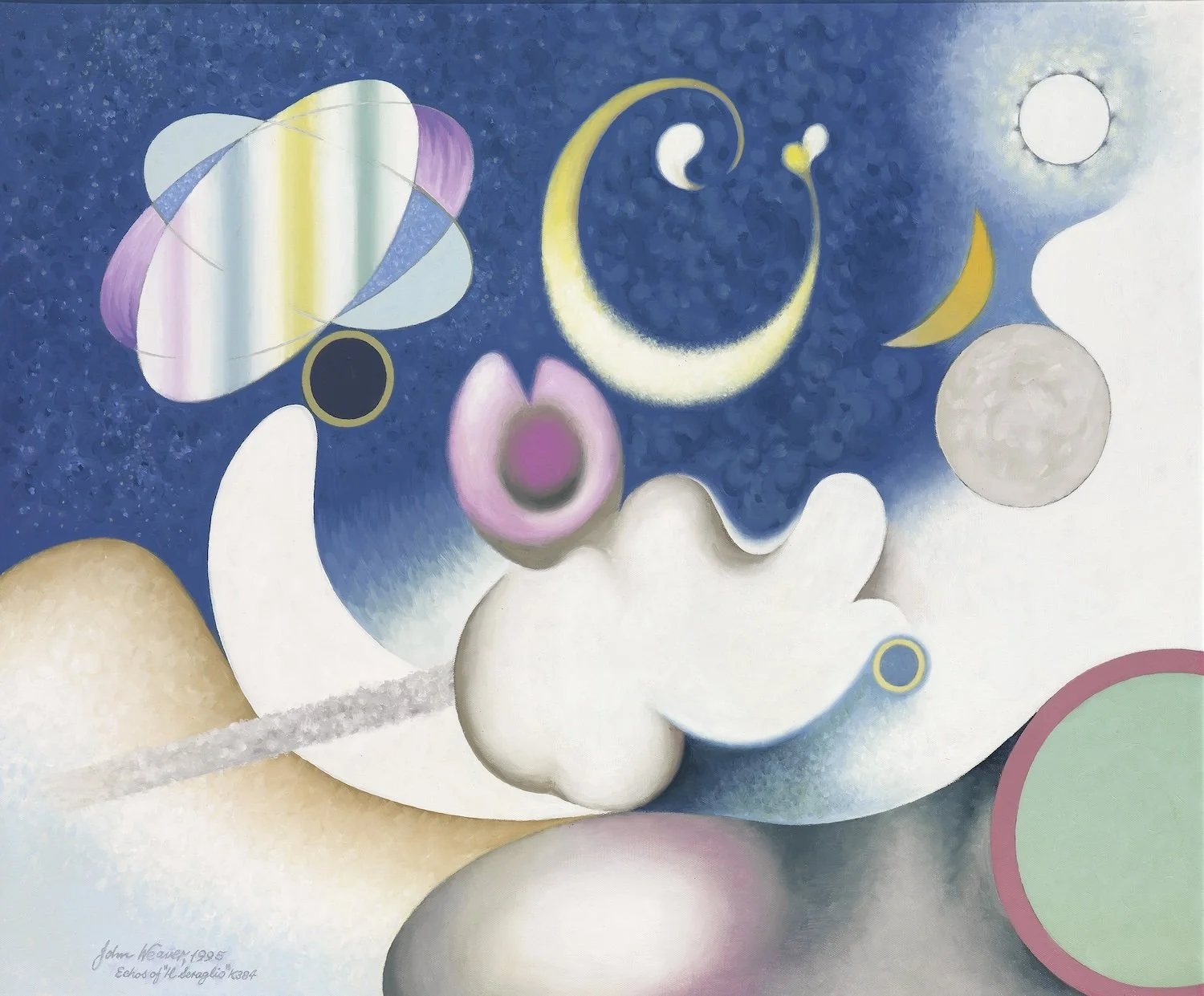 John loved talking about his Spatial composition project. He was a surreal classical artist favoring his unique concept of space beyond earth, outside the solar system. His paintings are classical in composition, and abstract in subject. His great concern was his classical spatial composition with every item in the picture relating to its distance in the real world from the other elements. He would say that they were not a mere cosmic chance but an absolute orientation of every item within the frame and that there is no question that it is crucial to the resolution of his paintings.